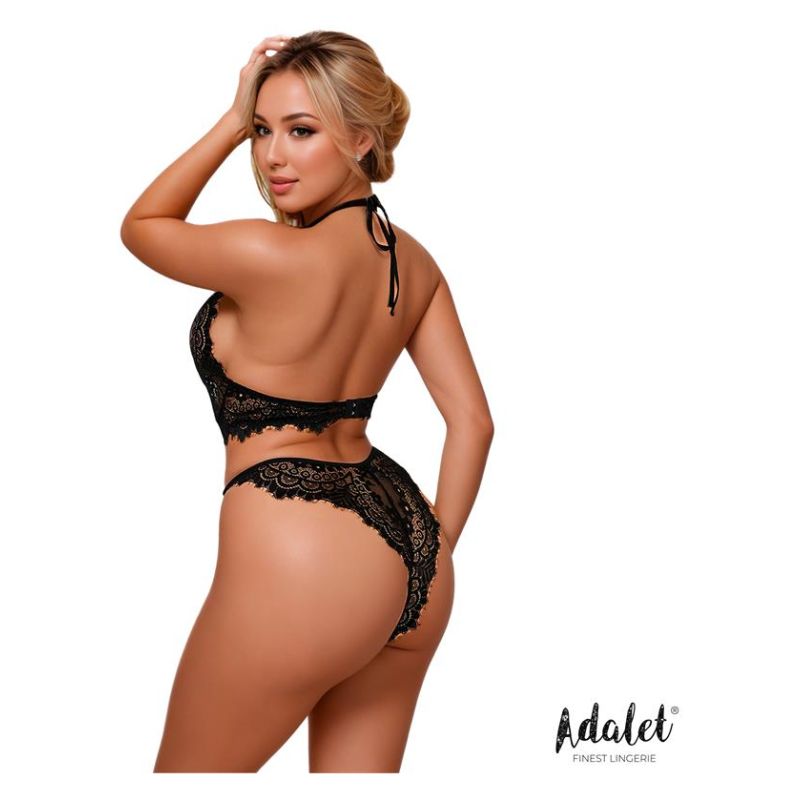 Set me dy pjesë që përmban një bluzë gjysmë të tejdukshme me dantellë lulesh dhe një tanga që përputhet.