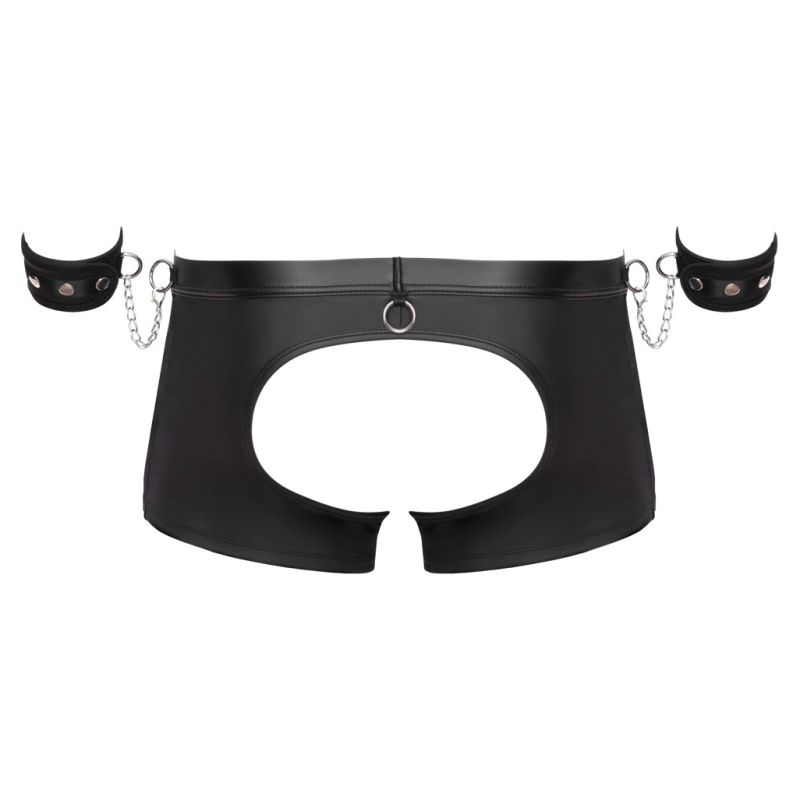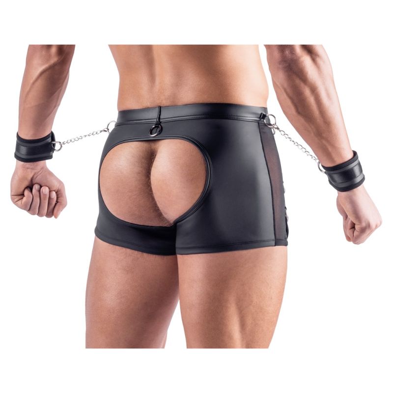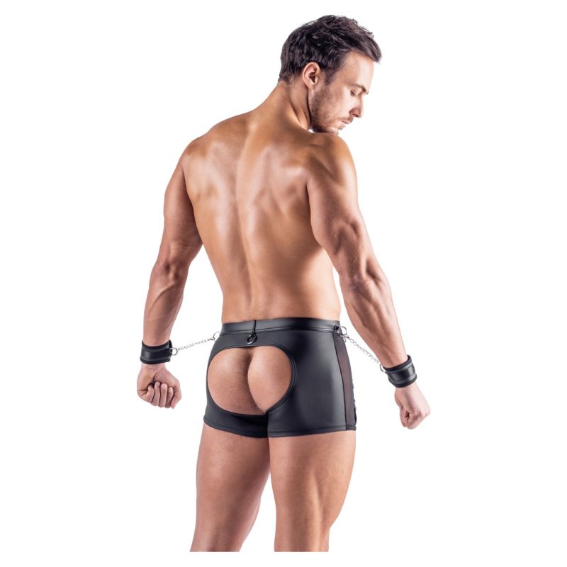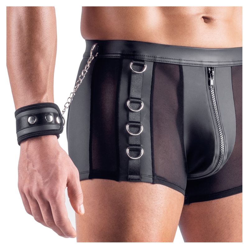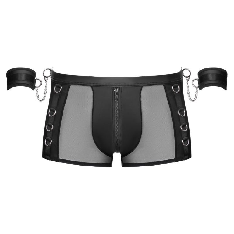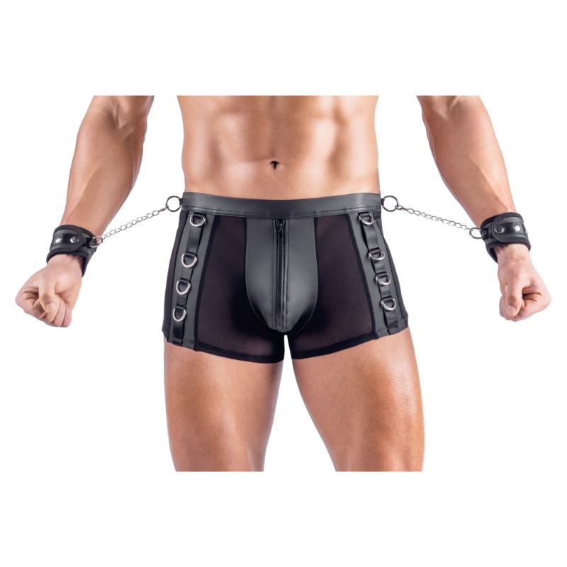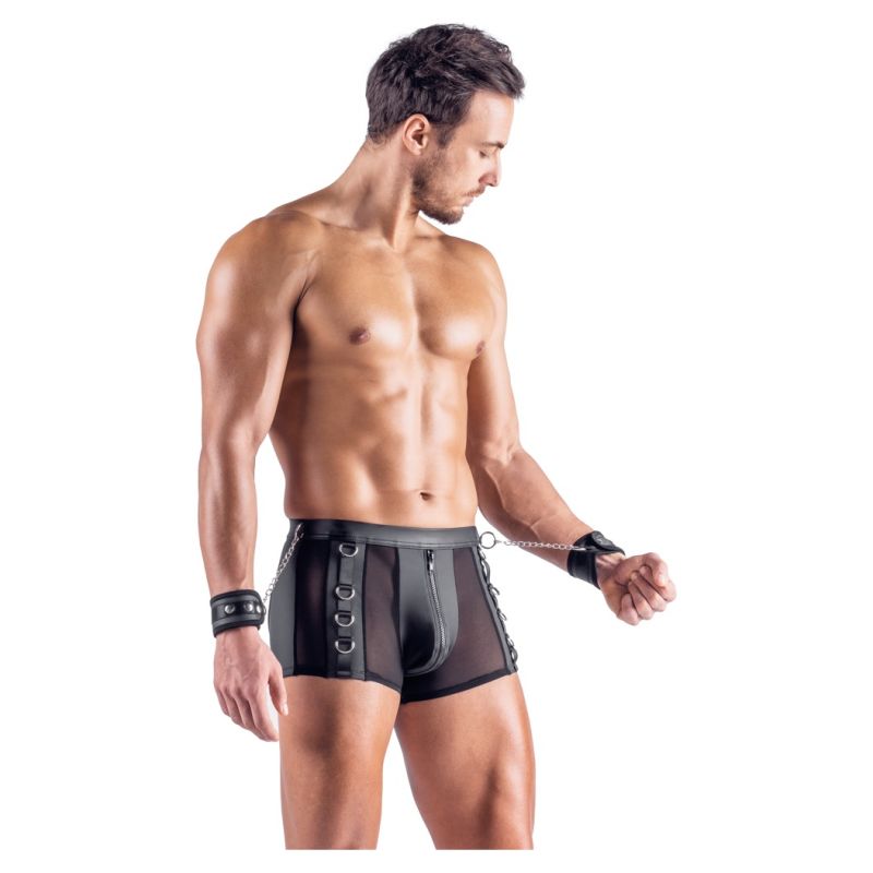 Bokset e zeza nga Svenjoyment Bondage përfshijnë pranga të buta. Bokse emocionuese me shpinë të hapur të bëra nga një përzierje e bukur e materialit me pamje mat dhe rrjetës. Bokset gjithashtu kanë detaje metalike me ngjyrë argjendi. Bokset janë të buta dhe elastike për një përshtatje shumë të rehatshme. Ka një zinxhir në qese. Ka unaza shtrënguese në brezin e mbuluar me pëlhurë dhe në anët e pantallonave. Prangat e përfshira me grepa me kapak mund të fiksohen lehtësisht në unaza. Prangat me pamje mat të butë mund të vendosen dhe rregullohen lehtësisht, falë kapëseve të tyre me grep dhe lak.