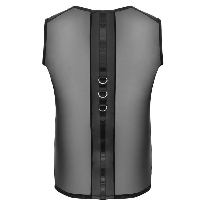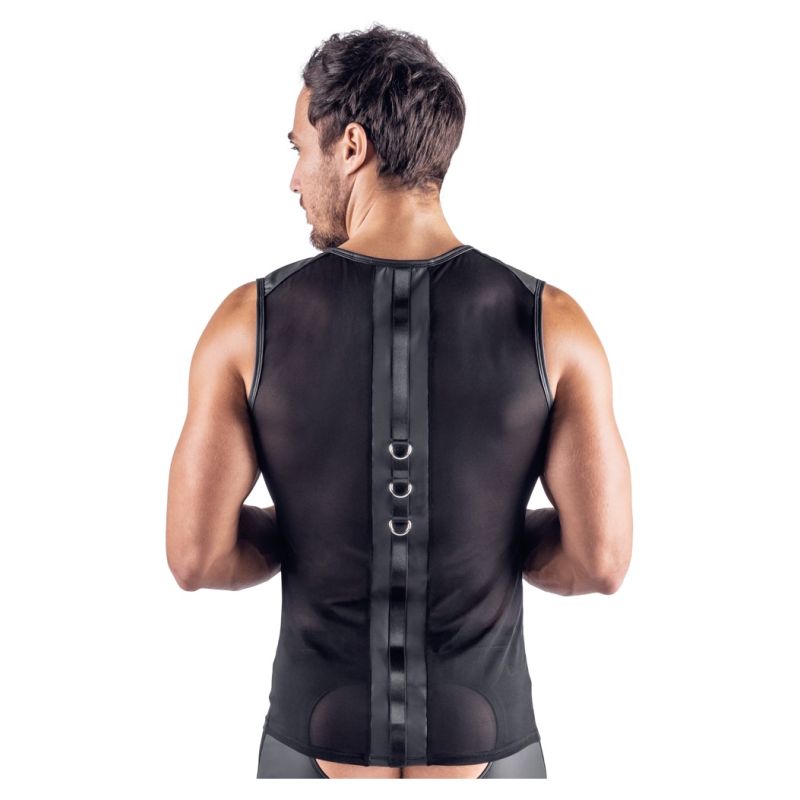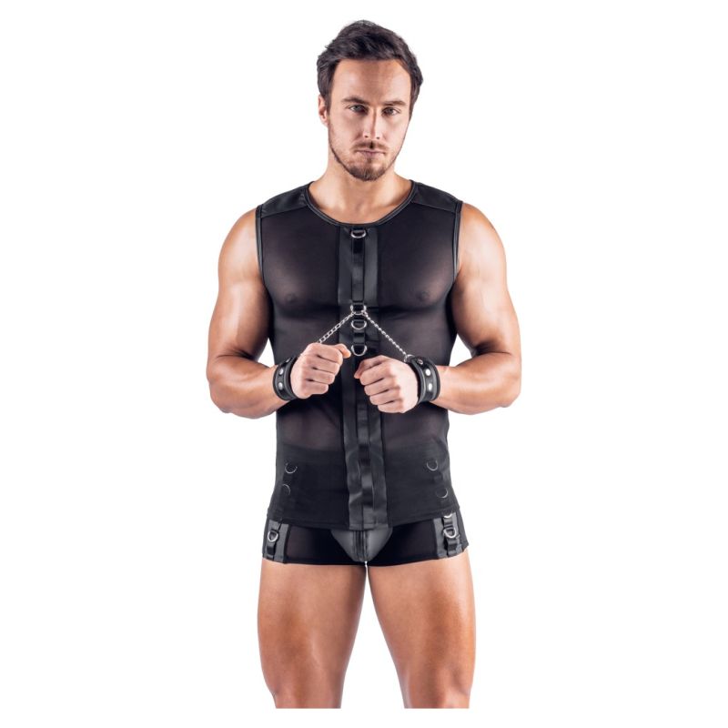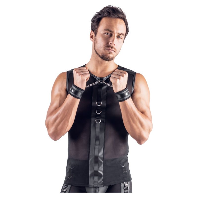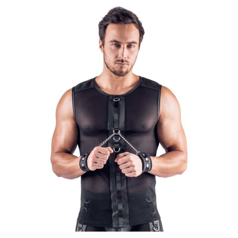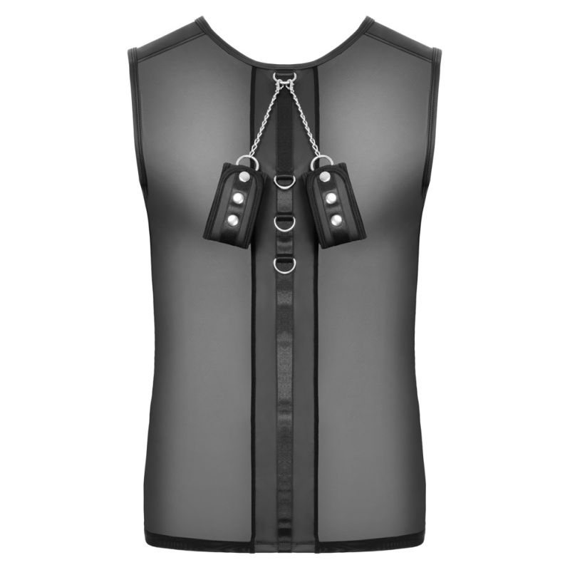 Kjo bluzë e zezë pa mëngë nga Svenjoyment Bondage përfshin pranga të buta. Bluza është bërë nga rrjetë e butë dhe elastike me detaje me pamje mat dhe aksesorë me ngjyrë argjendi. Ka një futje me pamje mat në pjesën e përparme dhe të pasme të bluzës. Ka unaza shtrënguese në futje. Prangat e përfshira me grepa që hapen mund të fiksohen lehtësisht në unaza. Prangat me pamje mat të butë mund të vendosen dhe të rregullohen shpejt, falë kapëseve të tyre me grep dhe lak.