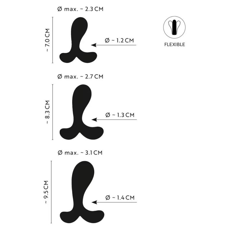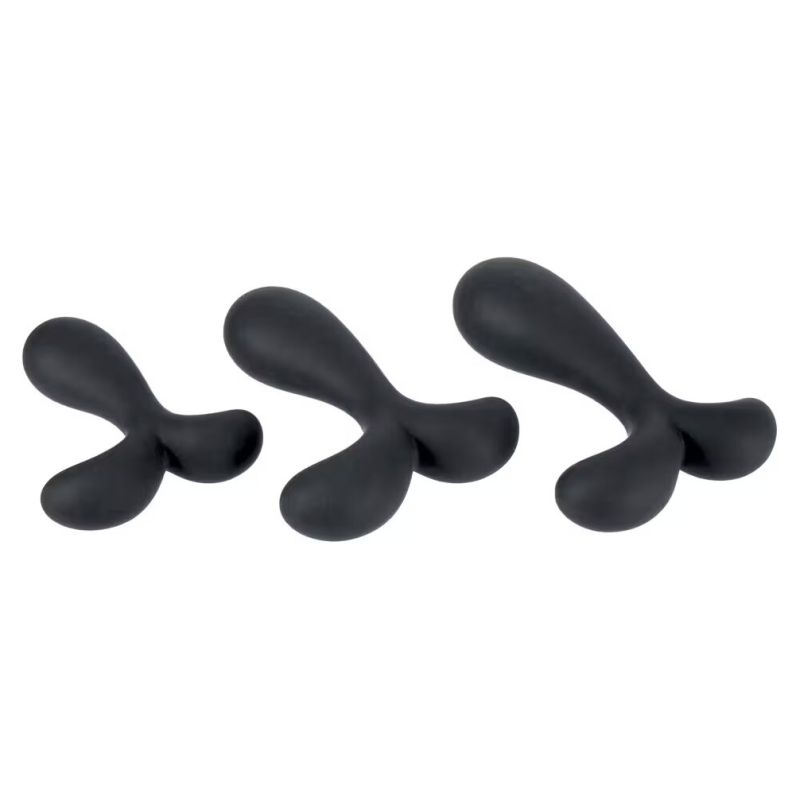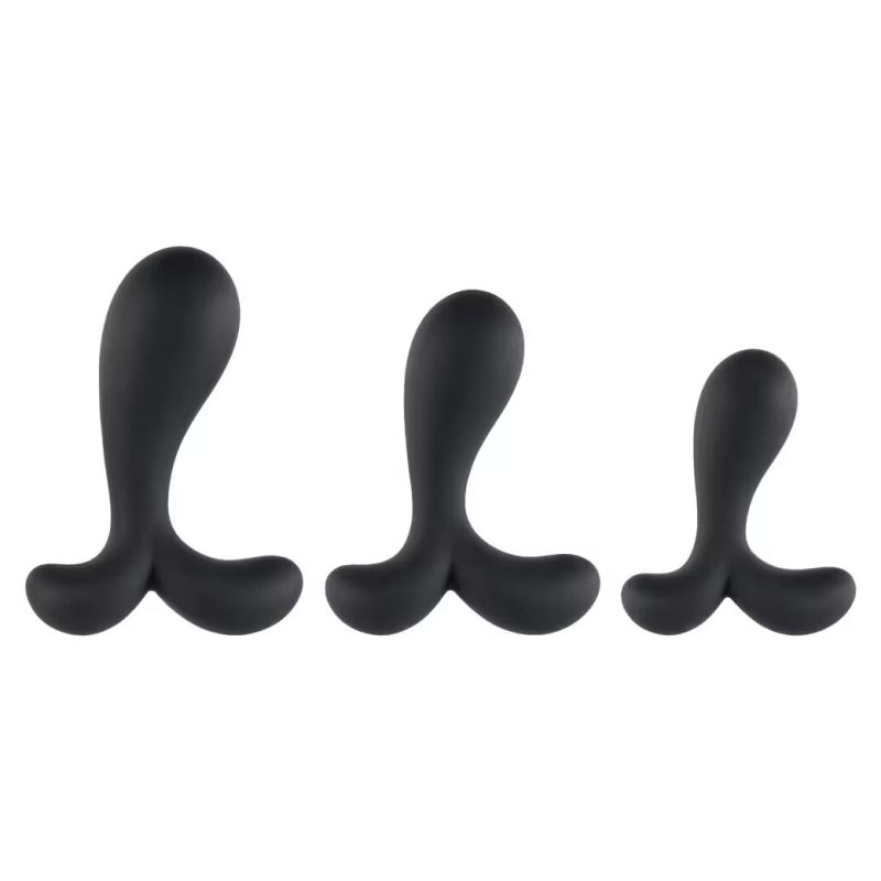 Set stërvitjeje për tapa vithe me maja pak të lakuara nga ANOS me 3 tapa vithe silikoni në madhësi dhe pesha të ndryshme. Perfekte për stimulim rektal dhe stërvitje shtrirjeje. Çdo tapë e lëmuar ka një majë pak të lakuar dhe të fryrë për të stimuluar posaçërisht prostatën (pikën P). Tapa me 2 krahë siguron një përshtatje të sigurt dhe argëtim, si dhe heqje të rehatshme. Të 3 tapat e vitheve janë bërë nga silikoni i butë si mëndafsh me një pjesë fleksibile konike. Për futje të lehtë, përshtatje optimale dhe rehati maksimale gjatë stërvitjes anale!