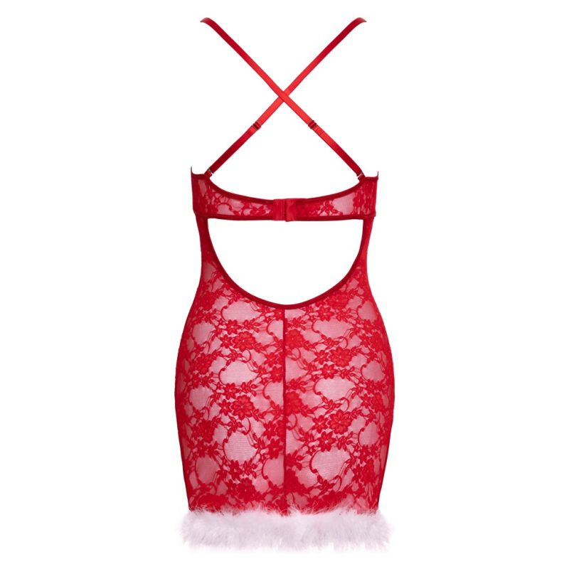 Këmish i ngushtë, X-Mas nga Cottelli LINGERIE, është bërë nga dantella delikate e kuqe. Është i butë dhe elastik për një përshtatje shumë të rehatshme. Pupla delikate të bardha dekorojnë kupat dhe skajin pa tela. Ka një çarje në të dyja anët e këmishës për lëvizje më të mirë. Rripat e reçipetave janë në një dizajn të kryqëzuar në pjesën e pasme. Rripat e reçipetave dhe rripi në pjesën e pasme me një kapëse me grep mund të rregullohen për t’u përshtatur.