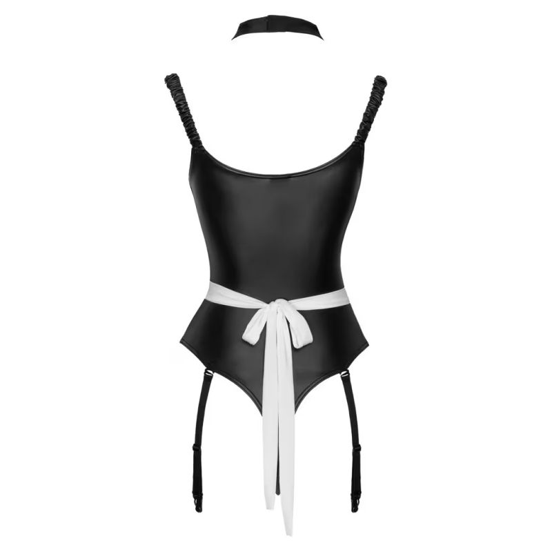 Seti i shërbëtores me 3 pjesë nga Cottelli COSTUMES përbëhet nga një trup me varëse, përparëse dhe xhokër. Trupi elastik i tangave është bërë nga material i zi me pamje mat me një prerje të ulët dhe me rrudha në dekolte. Është gjithashtu me prerje të ulët edhe në pjesën e prapme. Rripat elastikë, modernë dhe me rrudha të sytjenave mund të vishen edhe në një stil me shpatulla jashtë. Dizajni me këmbë të larta thekson këmbët dhe vithet. 4 rripat e varëses janë të rregullueshëm dhe të lëvizshëm. Përparësja e vogël e bardhë ka dantellë dekorative dhe i shton prekjen përfundimtare këtij stili seksi shërbëtoresh.