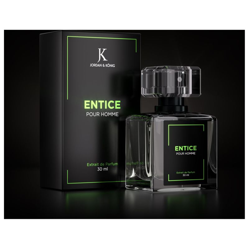 Këto aroma kombinojnë parfume të veçanta me cilësi të lartë me një formulë sekrete feromonesh për herë të parë, të cilat mund të kenë një efekt të papërmbajtshëm tek gratë dhe të kenë një aromë jashtëzakonisht të mirë. SUPERIOR rrezaton vetëbesimin dhe elegancën e një mashkulli alfa, ndërsa ENTICE thekson sensualitetin e burrit për të joshur gratë. Të dyja aromat përmbajnë feromone mashkullore të dozuara në mënyrë perfekte, të cilat janë provuar shkencërisht se rrisin atraktivitetin dhe dominimin. Aromat e shkëlqyera dhe efektet e synuara të feromoneve i bëjnë këto krijime unike: gratë mezi i rezistojnë aromave – dhe burrave që i veshin ato. Përjetoni një nivel të ri joshjeje me Jordan & König. Shënime aromatike Entice: Nota kryesore: ENTICE nga JK hapet me një buqetë joshëse me akorde të freskëta agrumesh që fuqizojnë shqisat me freskinë e tyre të shkëlqyeshme. Nota e zemrës: Nota të fuqishme duhani, mjaltë i ëmbël dhe një përzierje joshëse vaniljeje dhe kanelle shpalosen në zemër, duke krijuar një harmoni të ngrohtë dhe pikante. Nota bazë: Baza është një përbërje e ngrohtë që mbështjell ENCE me një aurë tërheqjeje të papërmbajtshme. Nuancat pikante dhe sofistikimi elegant i aromës lënë një përshtypje të qëndrueshme.