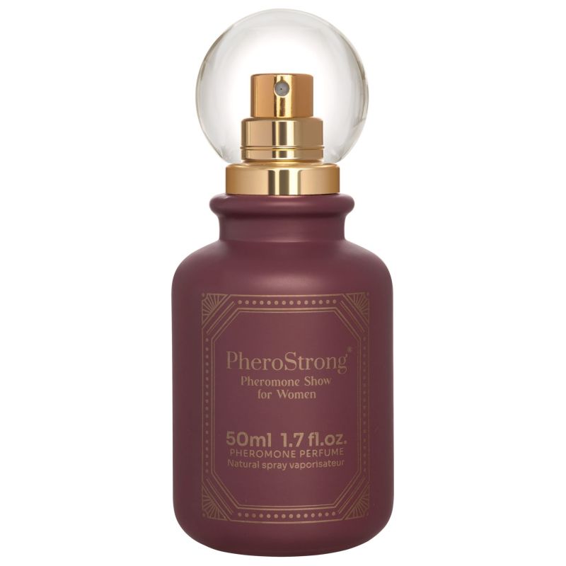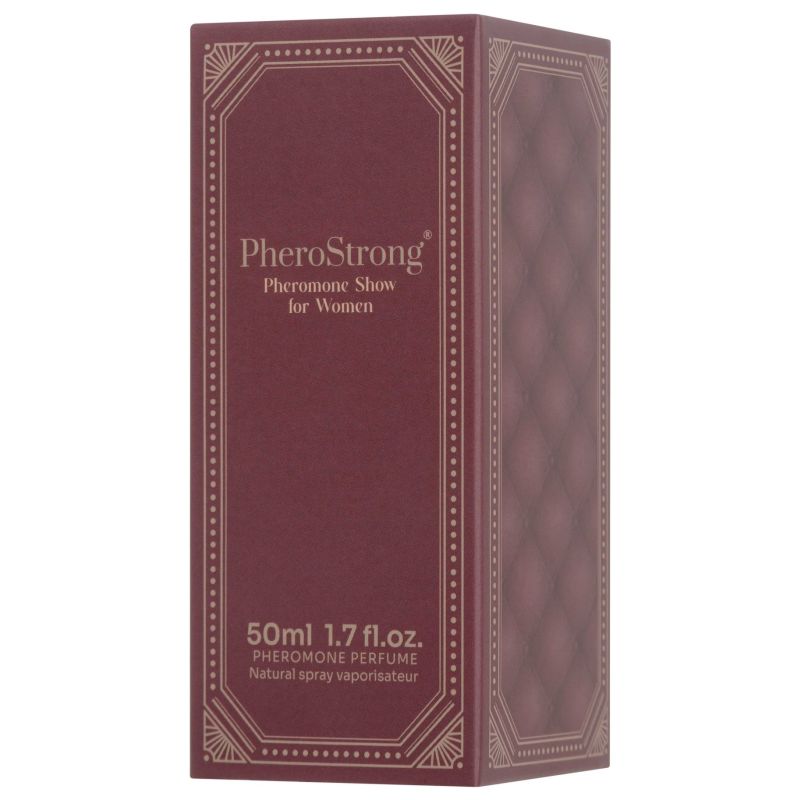 PheroStrong Show për gratë është krijuar për të magjepsur dhe joshur. Nota e zemrës është një përzierje romantike dhe sensuale e trëndafilit turk, jaseminit, kumbullës dhe qershisë lënguese. Nota bazë lë një përshtypje të thellë dhe të qëndrueshme me balsam të Perusë, fasule tonka, dru sandali, patchouli, vanilje dhe erëza. Nota kryesore: Liker, qershi, bajame Nota të zemrës: Qershi, trëndafil turk, jasemin, kumbull Nota bazë: Balsam peruan, fasule tonka, dru sandali, vetiver, kedër, benzoinë, kanellë, karafil, patchouli, vanilje