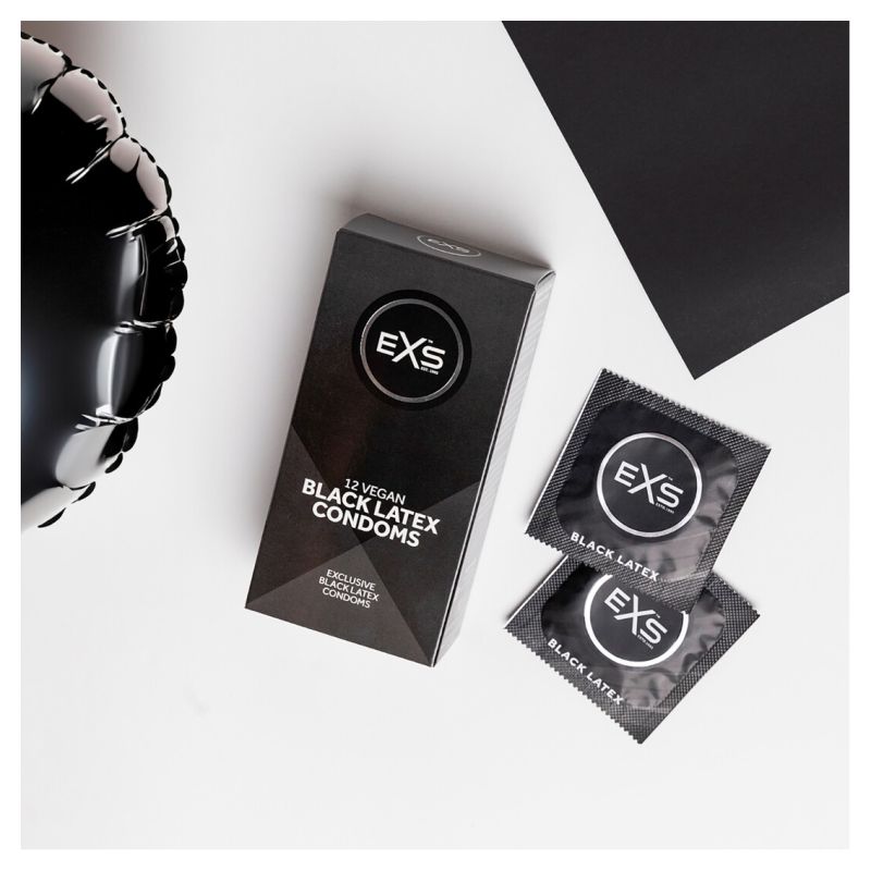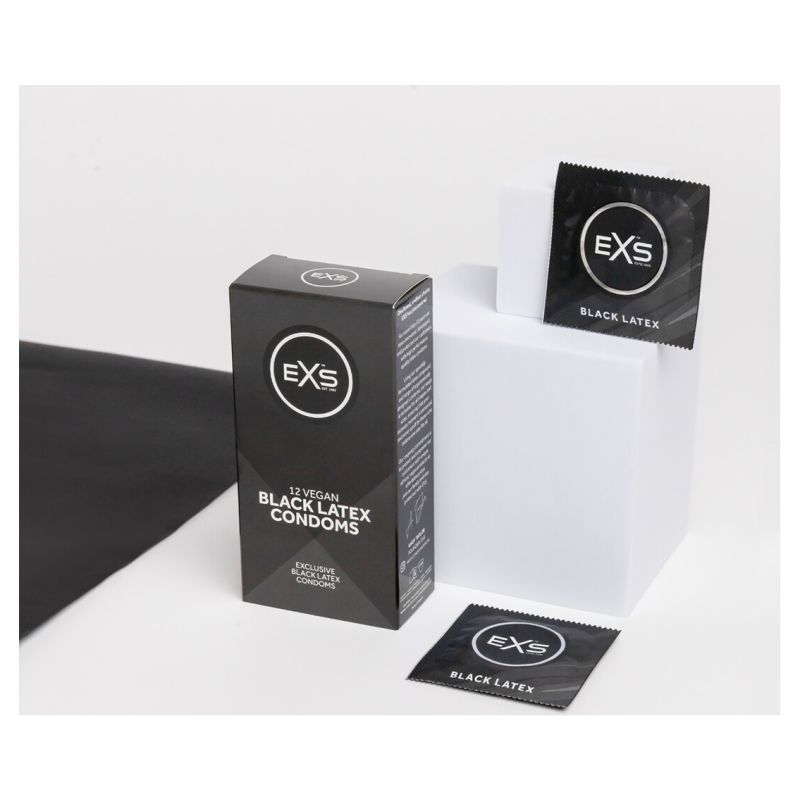 Prezervativët e lateksit EXS Extra Black nuk kanë erë lateksi dhe janë bërë nga një përbërës lateksi natyral i mëndafshtë me ngjyrë të zezë. Prezervativi i zi latex EXS ka një gjerësi 54 mm me një fund me majë të përshtatshëm. Prezervativët e zi latex EXS duken dhe ndjehen mirë. Prezervativët e lateksit të zi EXS nuk kanë erë lateksi dhe janë bërë nga një latex i hollë por i fortë i mëndafshtë.
