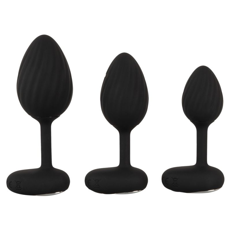 Secila prej tapave vibro në formë koni është bërë nga silikoni me cilësi të lartë dhe është e lehtë për t’u futur. Tekstura e theksuar me kanale është perfekte për stimulim të thellë. Çdo tapë përshtatet gjithashtu në mënyrë të përkryer në tunelin anal. Tapa e gjerë e pengon atë të rrëshqasë shumë thellë dhe është gjithashtu një tërheqës elegant, falë detajeve të saj metalike me ngjyrë argjendi. Pjesa jashtëzakonisht e ngushtë konike siguron veshje të rehatshme gjatë çdo lëvizjeje. Kjo do të thotë që tapat vibro të qeta mund të mbahen edhe për një periudhë më të gjatë kohore – p.sh. si një përforcues i orgazmës gjatë lojës dhe seksit solo ose si një aventurë sekrete anale gjatë jetës së përditshme.