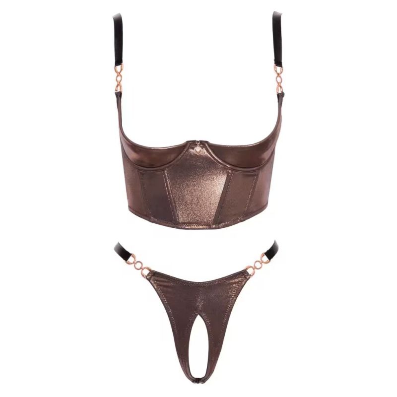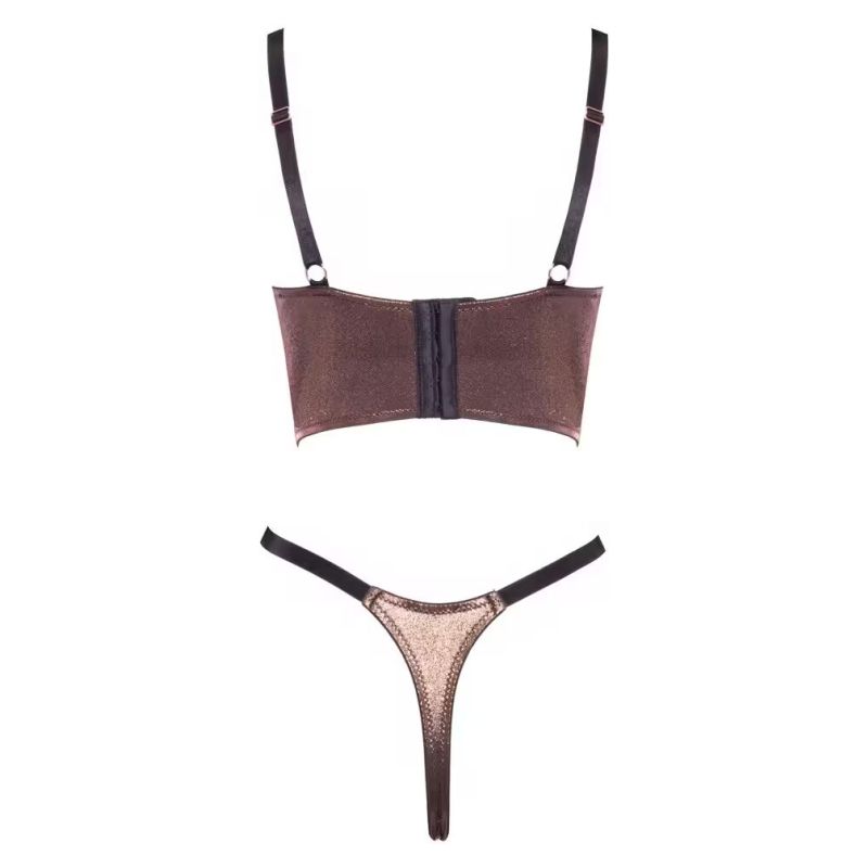 Seti luksoz pa mbathje nga Abierta Fina është i përbërë nga një reçipeta me raft dhe tanga. Seti është bërë nga një material elegant dhe i shkëlqyeshëm me ngjyrë bronz-ari me detaje të zeza dhe elementë elegantë me ngjyrë rozë-ari. Seti është i butë dhe elastik. Reçipetat me raft të gjatë kanë tela formësuese në pjesën e përparme dhe kupa me tela pak të mbushura për një përshtatje perfekte të kupës së hapur. Midis kupave ka një varëse të vogël dekorative në formë zemre. Gjithashtu ka një detaj të bukur në pjesën e përparme të secilit rrip reçipetash. Rripat e reçipetave janë të rregullueshëm. Ka një kapëse me grep të rregullueshëm në pjesën e pasme. Tanga është gjithashtu jashtëzakonisht joshëse sepse nuk ka fund të këmbës dhe për shkak të detajeve dekorative në pjesën e përparme të brezit elastik.