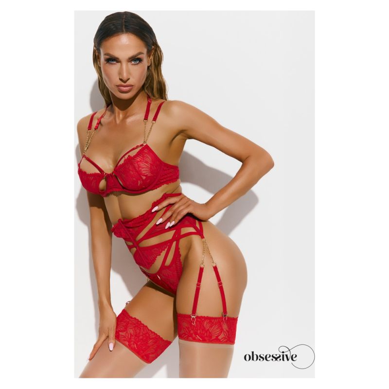 Seti Matildea nga Obsessive është i përbërë nga një sytjena me tela dhe tanga pa ijë. Është në një stil joshës – është bërë nga material i kuq i thellë me dantellë delikate dhe detaje dekorative me ngjyrë ari. Është i butë dhe elastik për një përshtatje shumë të rehatshme. Sytjena me tela ka zinxhirë në rripat e rregullueshëm të sytjenave dhe në qafën dekorative, të rregullueshme dhe të lëvizshme në fund të pasmë. Rripat me formë kupe gjithashtu mund të rregullohen për t’u përshtatur. Tanga pa ijë ka një zinxhir të vogël joshës mbi vithe dhe një detaj të vogël dekorativ në pjesën e përparme.