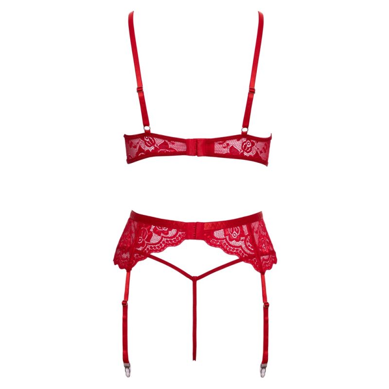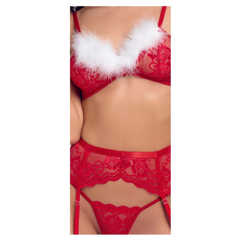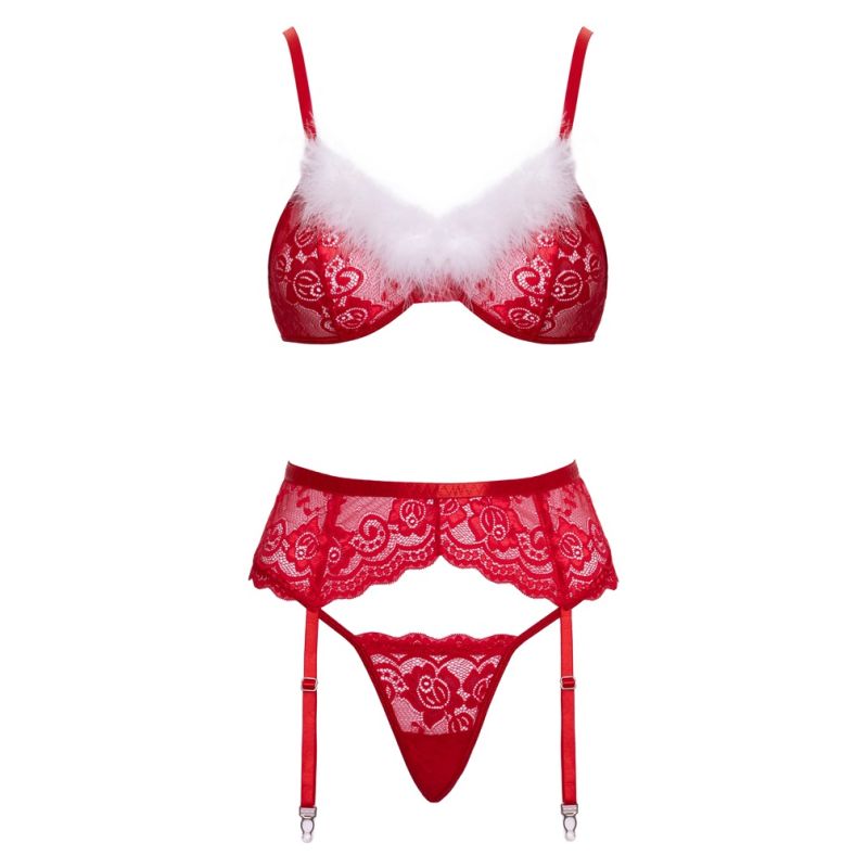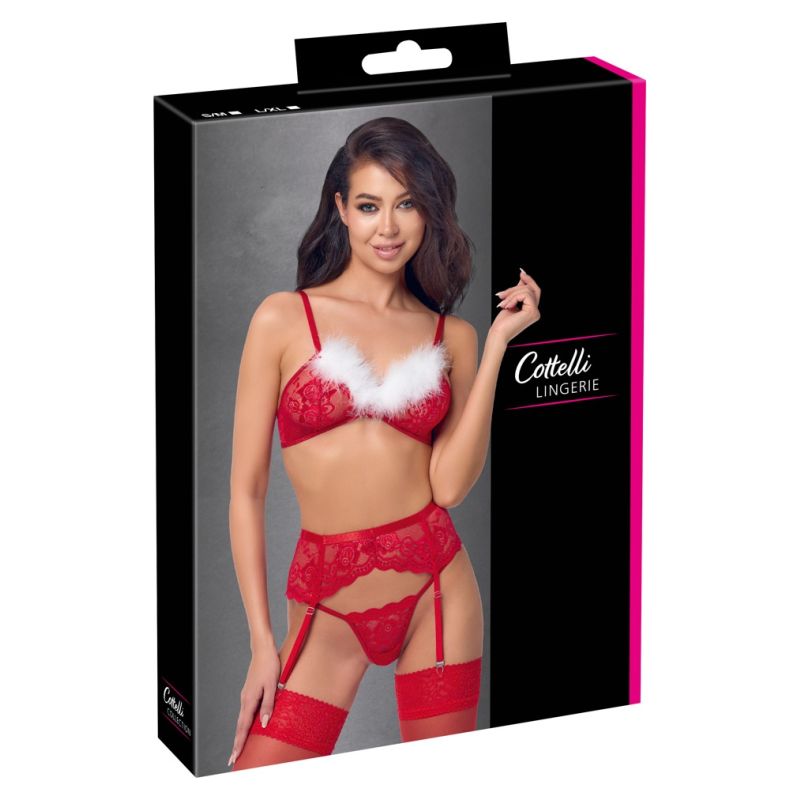 Seti me 3 pjesë për varëse, X-Mas nga Cottelli LINGERIE, është i përbërë nga një sytjena, rrip varëse dhe kordon. Seti është bërë nga dantellë e kuqe me lule, e cila është e butë dhe elastike për një përshtatje shumë të rehatshme. Ka dekorim delikat me pupla të bardha në kupat pa tela. Rripat e sytjenave dhe kapësi me grep në pjesën e pasme mund të rregullohen sipas përshtatjes. Rripi i varëses ka rripa varëse dhe një kapëse me grep në pjesën e pasme – gjithçka mund të rregullohet gjithashtu sipas përshtatjes. Kordoni i vogël i dantellës i shton prekjen përfundimtare këtij pamjeje festive joshëse.
