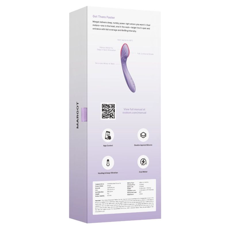 Përjetoni kënaqësi të thellë dhe precize me Vibratorin e Pikës G me Motor të Dyfishtë të Kontrolluar nga Aplikacioni Svakom Margot – Vjollcë. I projektuar për stimulim të synuar, Margot përmban motorë të dyfishtë që ofrojnë vibrime të fuqishme si përmes majës ashtu edhe përmes qafës, duke ofruar stimulim të njëkohshëm të pikës G dhe hyrjes për një përvojë gjithëpërfshirëse.